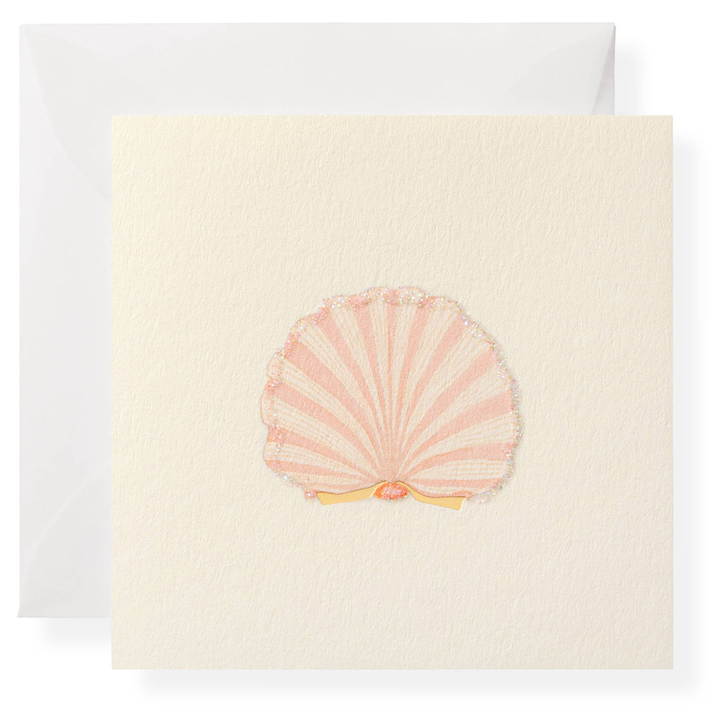 Our Cabana Shell Gift Enclosure is printed and hand-glittered in Memphis, TN. Hand crafted artwork, full color ink printed on natural white paper, foiled, hand-glittered, and paired with a vellum envelope. Book-folded enclosure card, blank on the inside. Paper color | natural white. Envelope color | vellum. Print process | full color + letterpress Embellishment | hand-glittered + gold foil Dimensions | 3 x 3 inches.