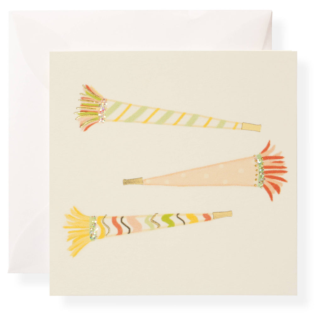 Our Party Horns Gift Enclosure is printed and hand-glittered in Memphis, TN. Hand crafted artwork, full color ink and letterpress printed on natural white paper, hand-glittered, and paired with a vellum envelope. Book-folded enclosure card, blank on the inside.