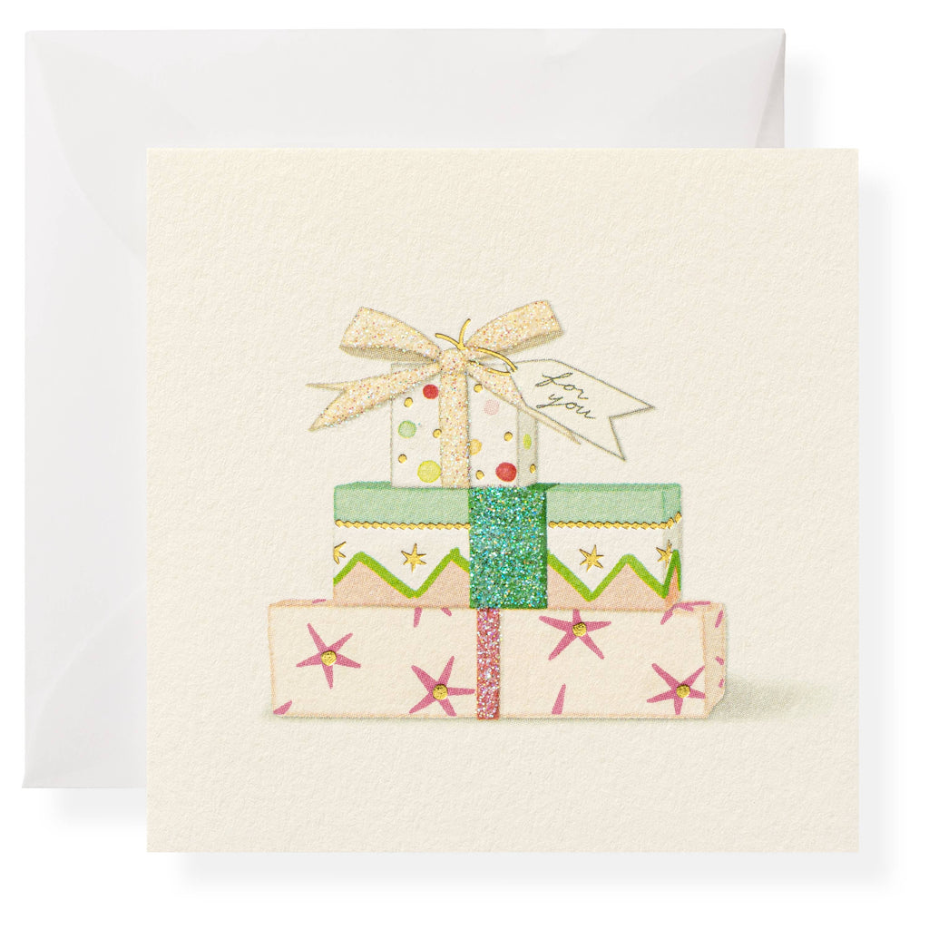 Our Presents Gift Enclosure is printed and hand-glittered in Memphis, TN. Hand crafted artwork, full color ink printed on natural white paper, hand-glittered, and paired with a vellum envelope. Book-folded enclosure card, blank on the inside.
