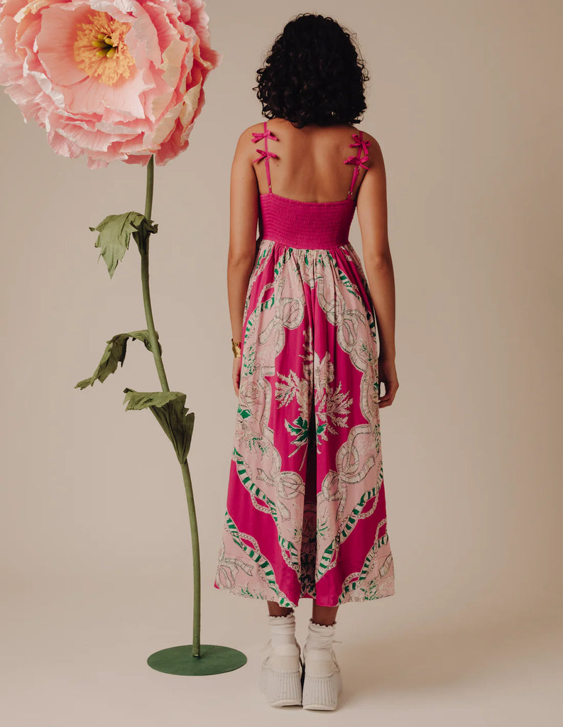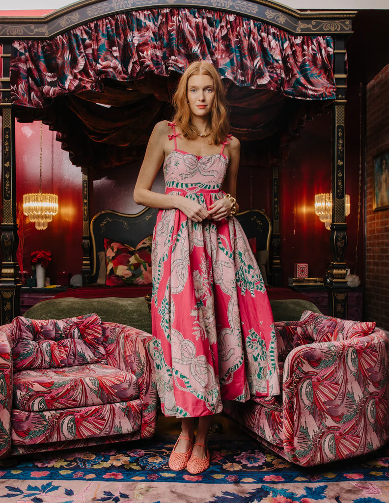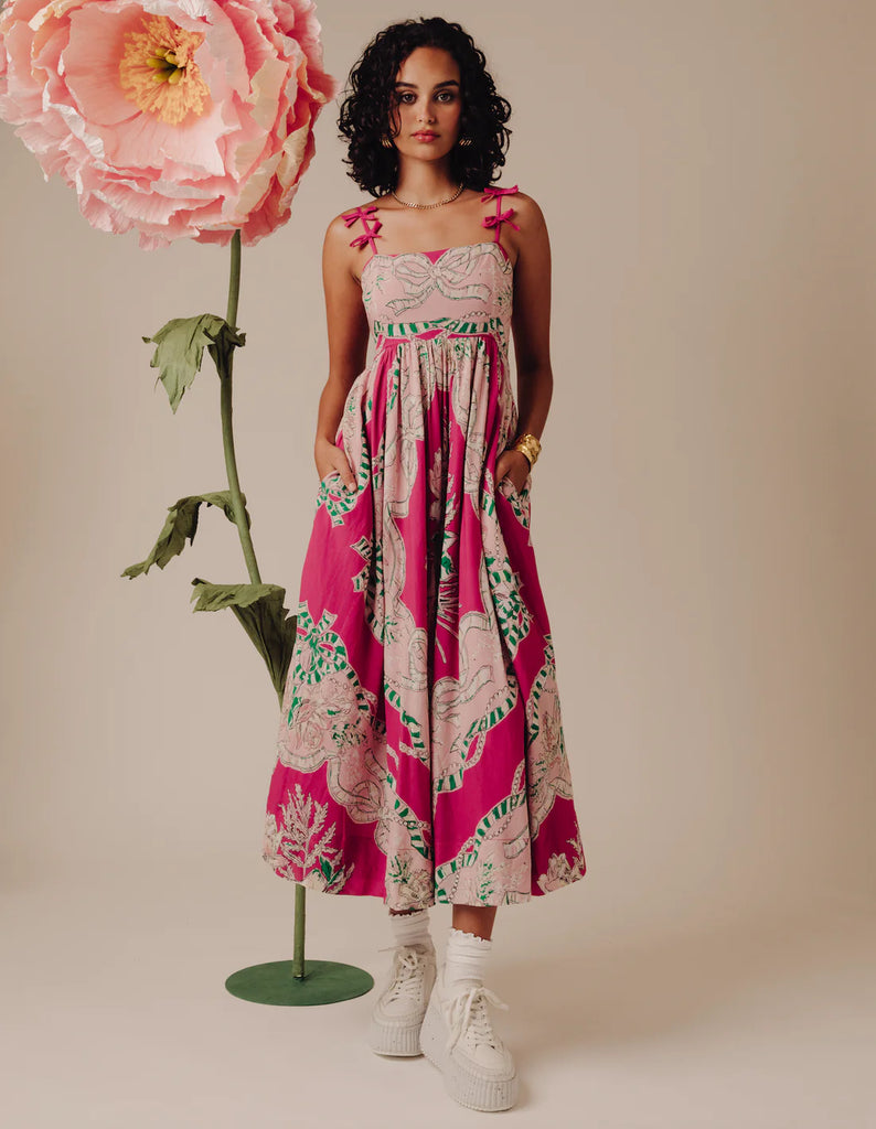 The Ryah Dress in Belle Bow Print blends whimsy and sophistication. Its soft, flowing fabric cascades gracefully, while the bow-inspired floral print adds a delicate charm. The fitted bodice contrasts beautifully with the voluminous skirt, creating a flattering hourglass silhouette. Perfect for garden parties or romantic evenings, this dress will leave you feeling effortlessly beautiful.