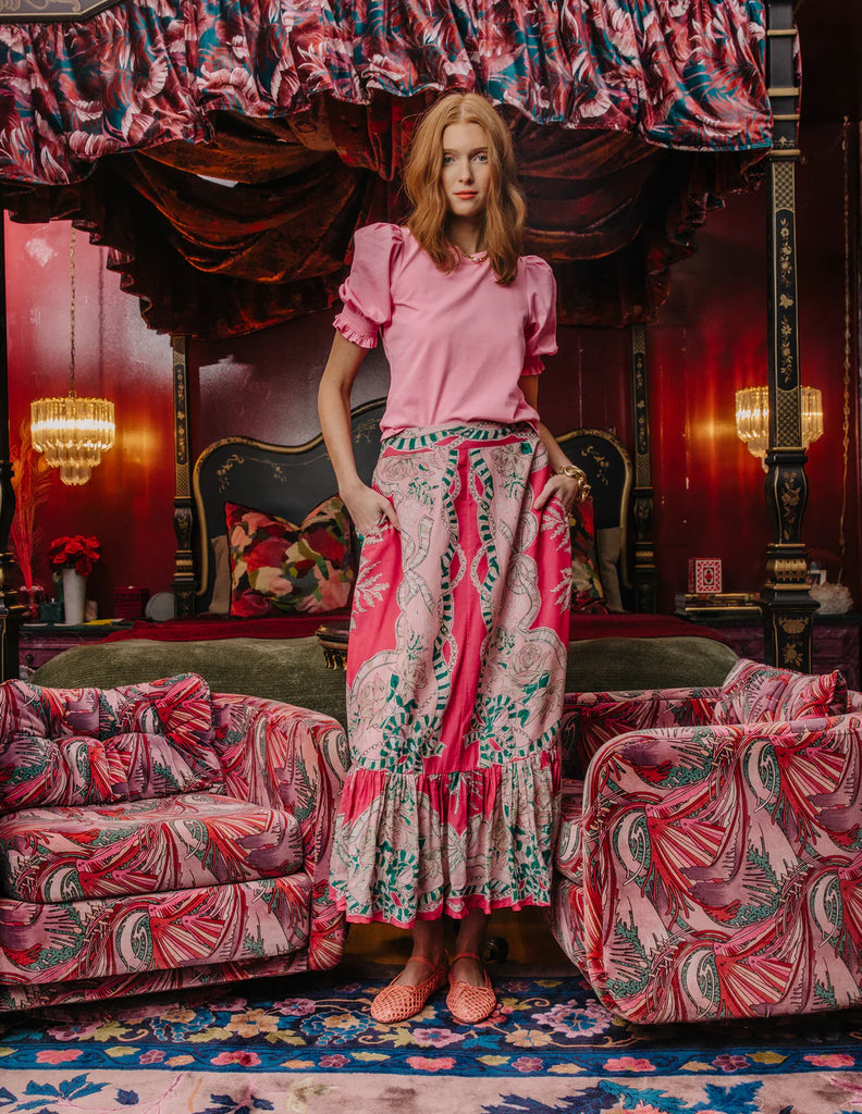 The Filippa Skirt in Belle Bow Print exudes charm with its flowy silhouette and romantic floral design. The bow-like accents in the print give it a unique, playful appeal. Designed with a mid-rise fit, this skirt falls gracefully to flatter your shape while providing movement and elegance. Pair it with a simple blouse for an effortlessly chic outfit.