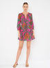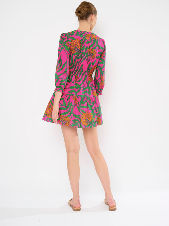 The Cova Dress in a botanical print on a pink background