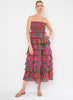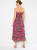 Strapless tiered midi length dress with a smocked bodice