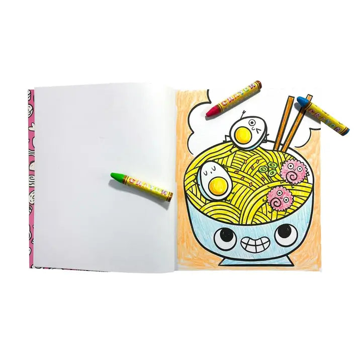 • Coloring book includes funny illustrations of happy snacks including pizza, ice cream, cupcakes, and more
