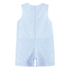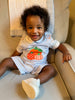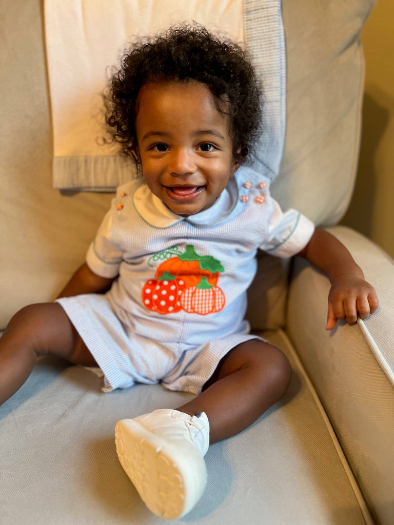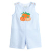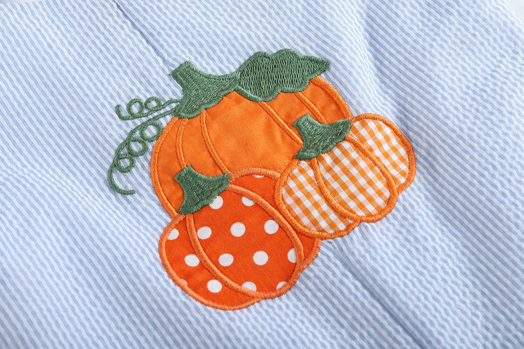 Pumpkin-tastic! This adorable blue seersucker shortalls are detailed with a pumpkin applique. These shortalls feature buttons for easy changing, cute button detailing on the shoulders and made in the softest 100% cotton. This outfit will be the perfect choice for fall from wandering corn mazes to the big turkey dinner.