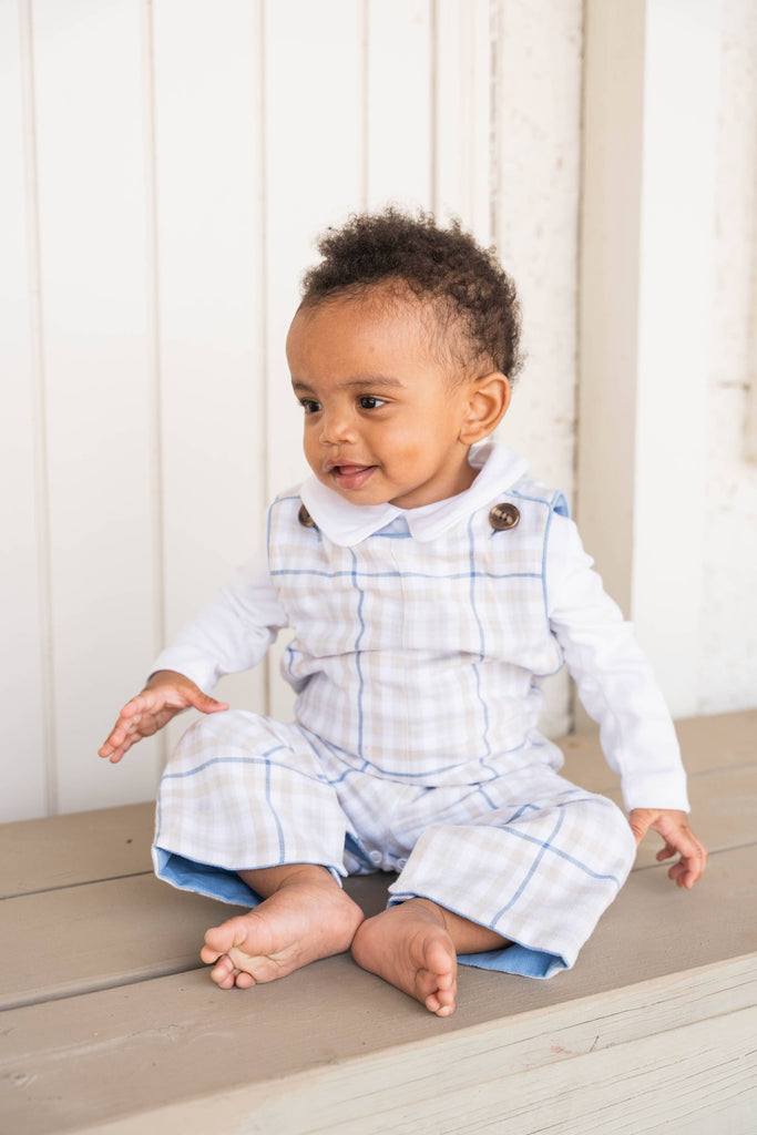 Double the style with the Rivers Reversible Longall in Khaki/Blue Plaid. This versatile john john features a classic plaid pattern on one side and a solid medium blue corduroy on the other, giving you two looks in one. Crafted from 100% soft cotton, it’s comfortable for all-day wear and offers beautiful monogram possibilities. Pair it with our Carter Oxford button-down for the perfect coordinated sibling look.