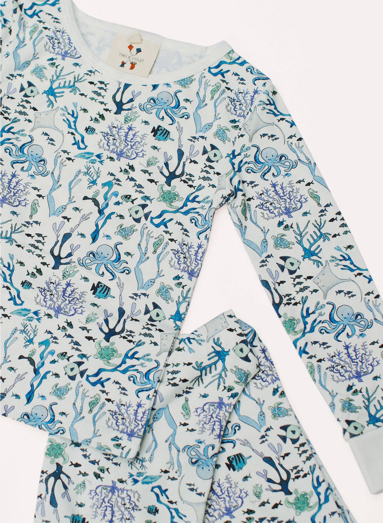 Make bedtime something to look forward to. Our Organic Cotton Long Sleeve Top and Pant Pajama Set is crafted for comfort and designed to delight, featuring our exclusive Coral Reef print.