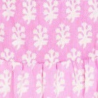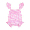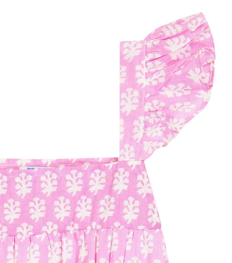 A sweet and delicate ruffled sleeve romper with adjustable straps and snap bottom closure. 100% cotton voile.