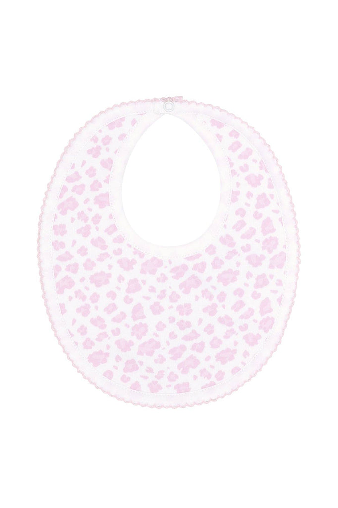 The bib features a trendy pink cheetah print that adds a touch of fun and flair. The charming pink picot trim elegantly outlines the edges, enhancing the overall look with a delicate and sophisticated detail.