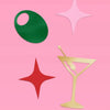 Gold martini glasses, green olives + pink and red sparkles