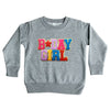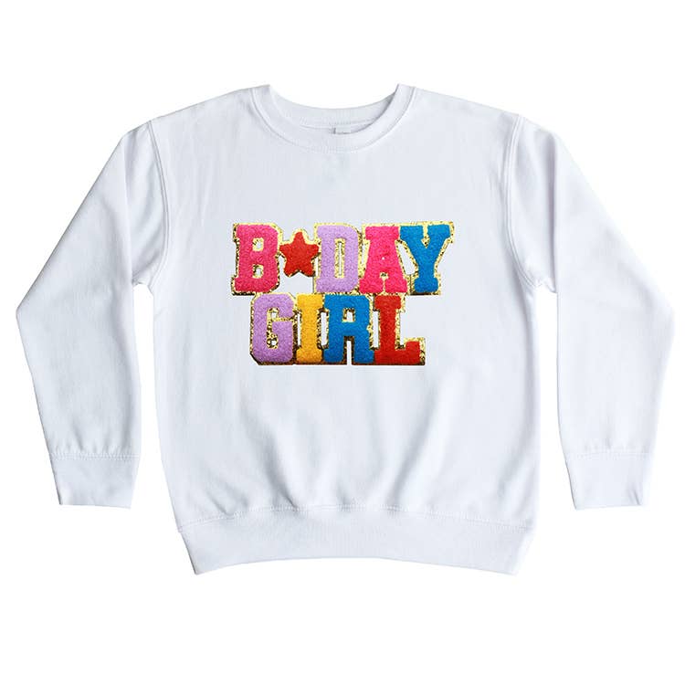 Cute sweatshirt with colorful Chenille Bday Girl. Great sweatshirt to celebrate your Birthday. Choose, white, pink or grey sweatshirt.