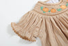 Get your little one ready for Fall festivities in this Light Brown Pinstripe Pumpkin Smocked Bishop Dress! Featuring a sweet smocked neckline adorned with embroidered pumpkins and pretty brown rickrack trim, this dress captures the spirit of the season. Made from 100% cotton and designed to fall to mid-calf/ankles, it’s perfect for Thanksgiving dinners, family photos, or autumn outings.