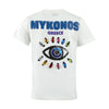 Stylish T-shirt featuring a bold "Mykonos Greece" graphic with a striking evil eye design, adorned with colorful gem embellishments for a unique, eye-catching look