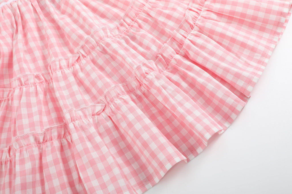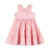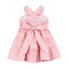 Add a playful pop of pink to her wardrobe with this Pink Gingham Check Layered Sundress. Featuring classic pink and white gingham, this dress is designed with crisscross straps, soft ruffle tiers, and pretty white rickrack trim for extra charm.