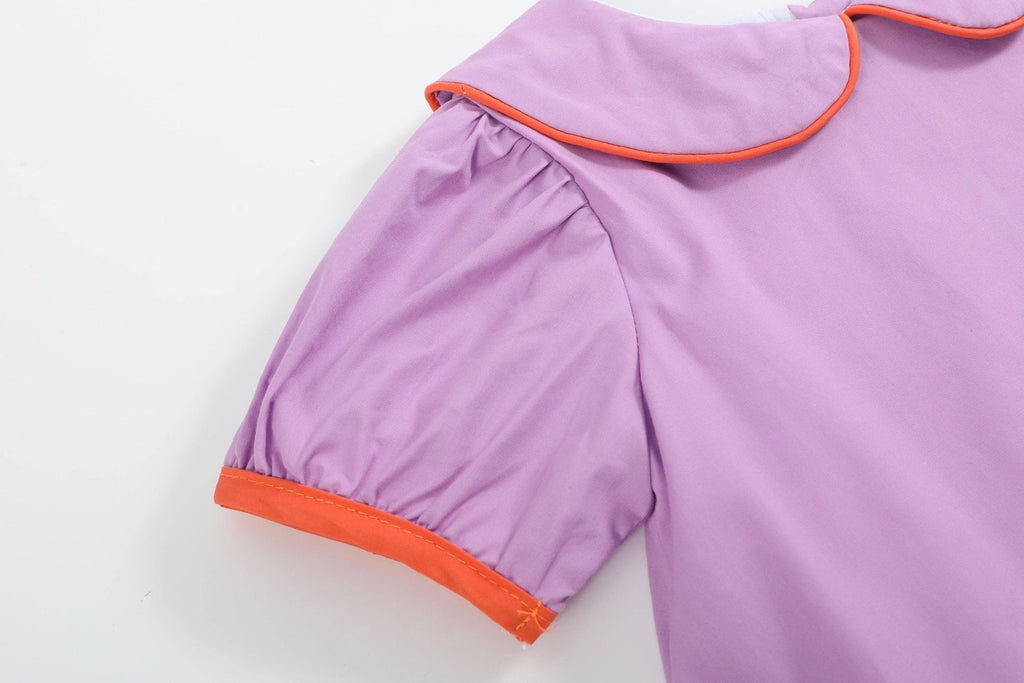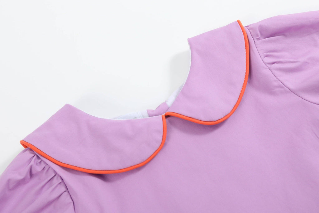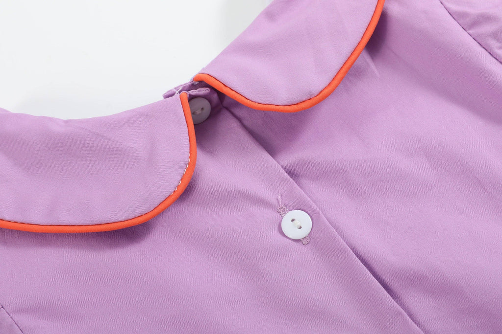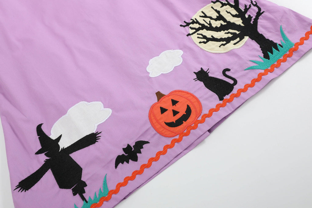 Get your little one ready for Halloween in style with our Purple Halloween Scene Girls Dress! This dress features a charming applique of a spooky Halloween scene, this dress is perfect for spooky fun. The classic peter pan collar adds a touch of elegance, while the button-up back ensures easy styling and a comfortable fit. Designed for babies, toddlers, and girls, this dress is ideal for Halloween parties, trick-or-treating, and festive family gatherings.