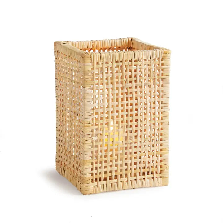 The tightly woven design and natural tones of the rattan make this hurricane stand out. Complete with a closed bottom glass insert, it may also be used as a vase. How sweet!