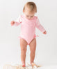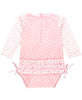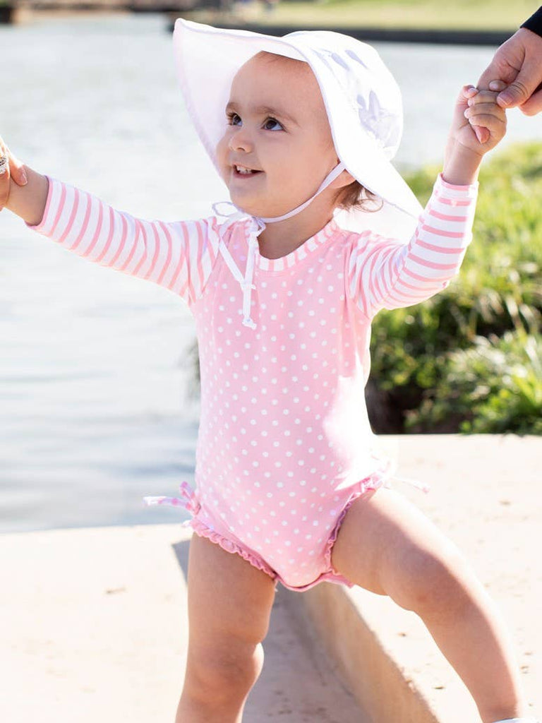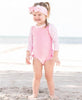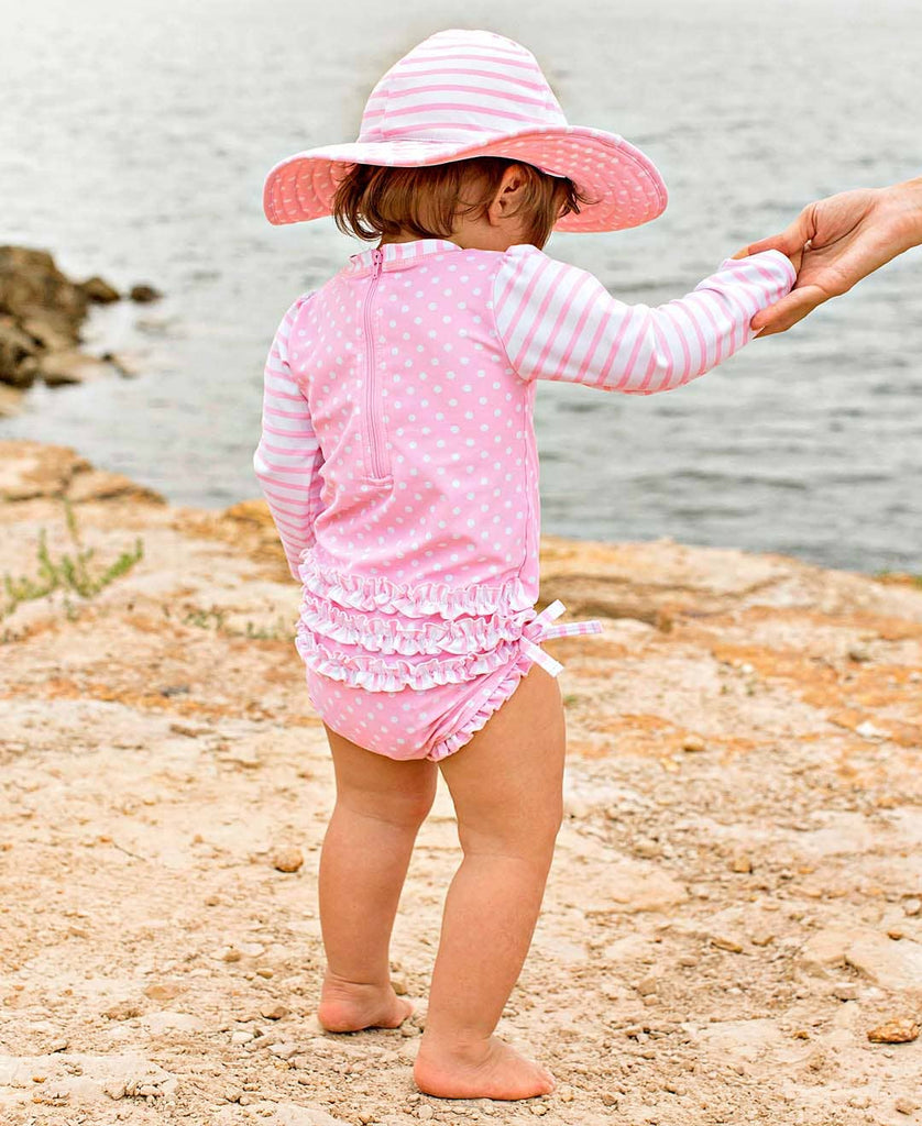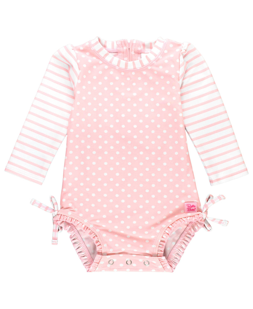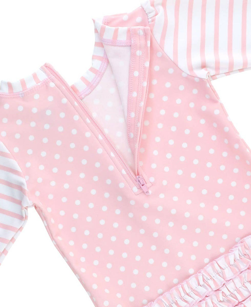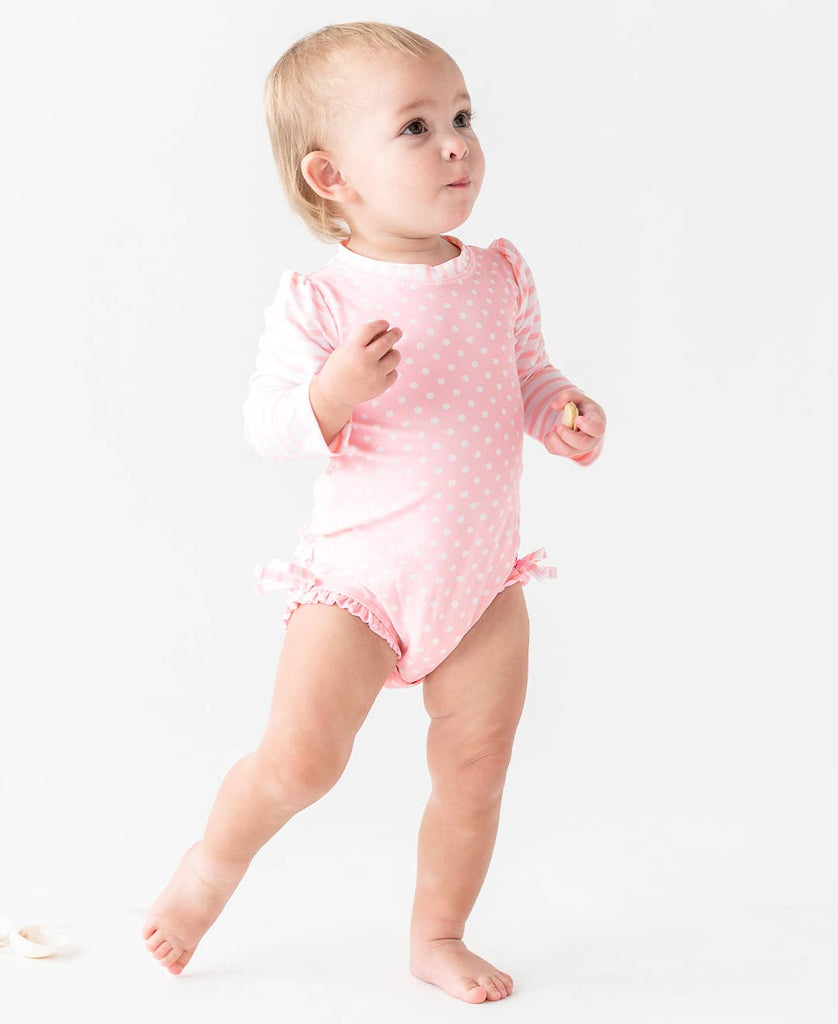 Baby Girls Pink Polka Dot Long Sleeve One Piece Rash Guard Swimsuit with Signature Rear Ruffles