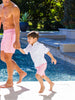 Complete your boy's summer swim outfit with these Swim Trunks. With its inner mesh lining and adjustable drawstrings on the inside, not only will he look good but feel good, too. Made with UPF 50+ sun protective fabric for all day protection and comfort.