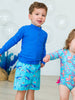 Complete your boy's summer swim outfit with these Swim Trunks. With its inner mesh lining and adjustable drawstrings on the inside, not only will he look good but feel good, too. Made with UPF 50+ sun protective fabric for all day protection and comfort.