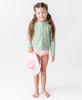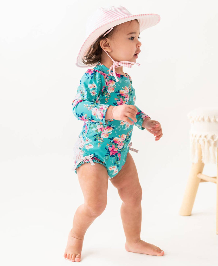 This ultra girly toddler swim hat has built in UPF 50+ sun protection to keep your baby girl extra safe from the sun's harmful rays. All sizes feature functional ties and can be styled two ways: tied under the chin to ensure a snug fit or tucked up through the brim and tied in the back in a fun bow!