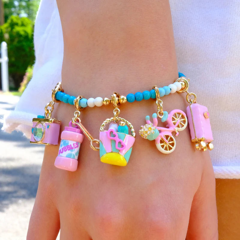 Add the perfect POP of pink to a charm bracelet with the Gold Bubbles charm featuring a dangling wand for a little extra glam!