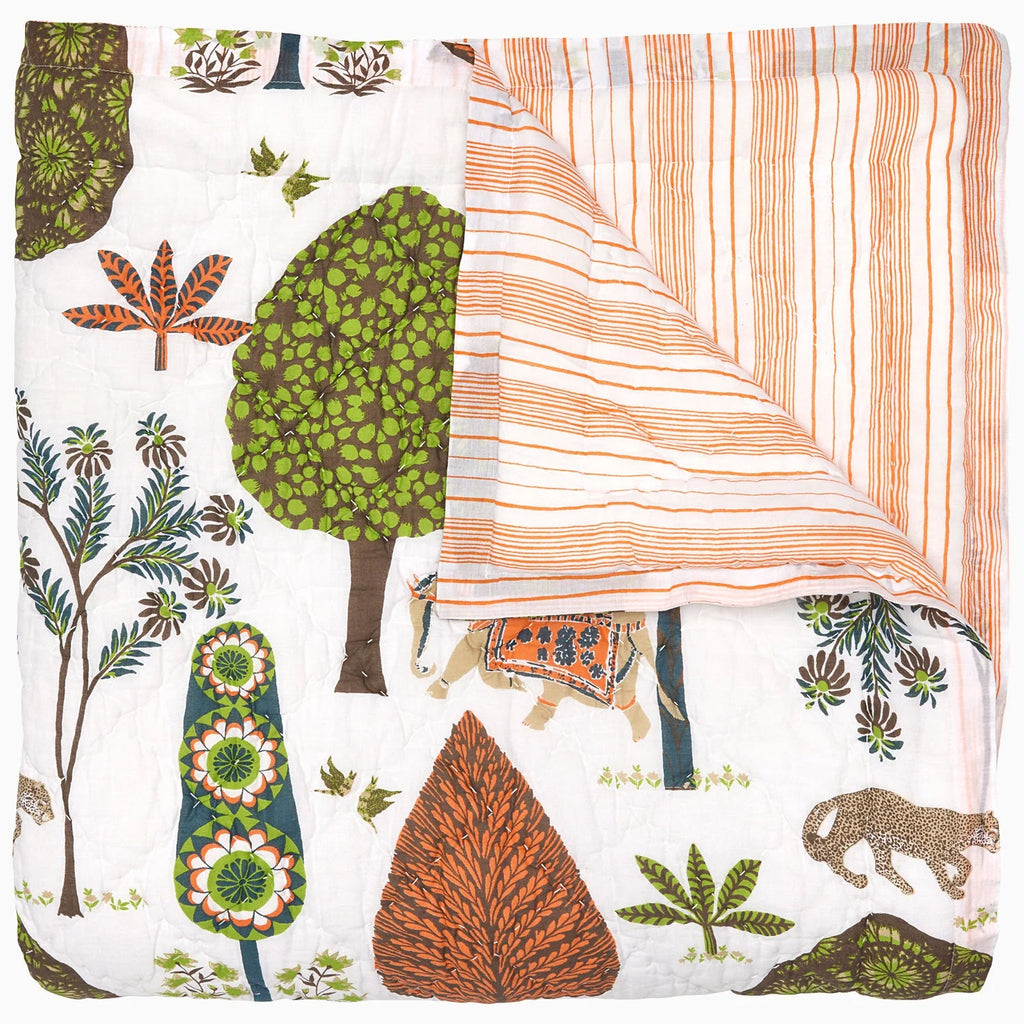 A bold jungle toile brimming with autumn foliage, prowling jaguars, stately horses and elephants on parade.