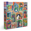 Cats in Windows, 1000 Piece Jigsaw Puzzle. Artist, Asta Barrington's original illustration of wandering, colorful cats combine to create a portrait of a day of rest, exploration, mischief, and quiet curiosity.