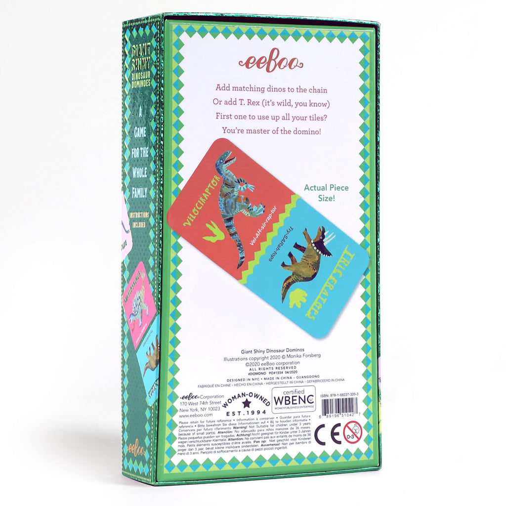These beautiful jumbo dominoes add dinosaurs and shiny holographic foil to a classic family game that develops matching skills. The classic game of dominoes is one the whole family can enjoy together. • Matching, concentration skills are learned with this classic game for the whole family. • Age: 3+ • Box size: 8.5 x 4.5 x 1.75 • Players: 2 or more • Includes: 28 thick, die-cut dominoes with foil highlights • Sustainably sourced: Made with recycled board and printed on FSC®-certified paper using vegetable-based inks.