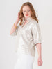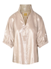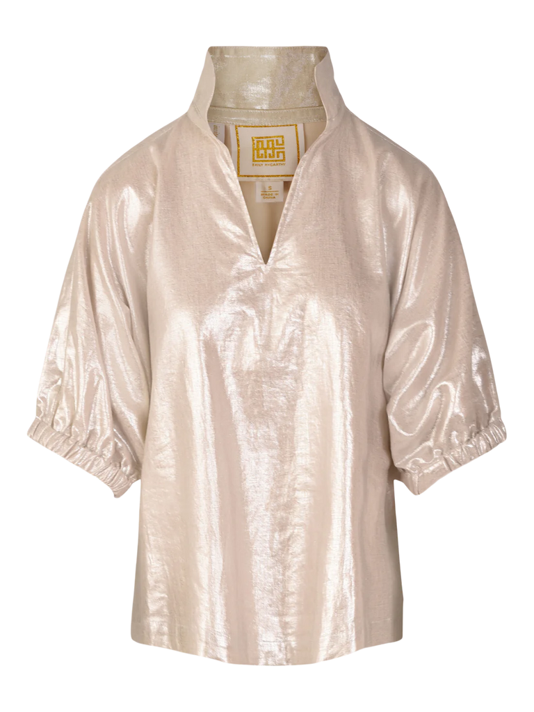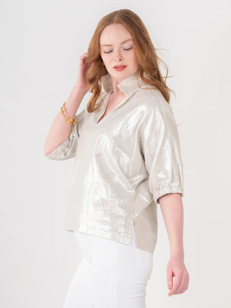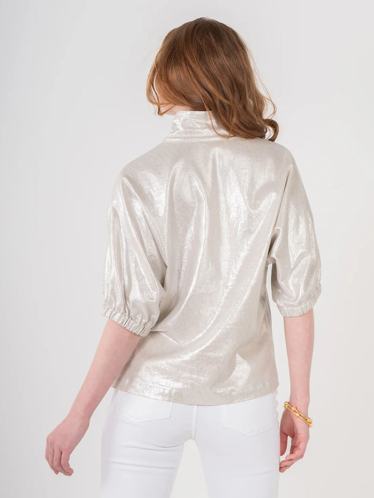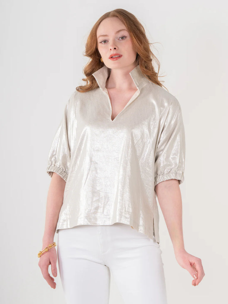 The tried and true Poppy Top in Platinum is fabricated in a shimmering metallic linen, making a subtle statement with it's classic style and luxurious texture. The classic stand collar serves effortless sophistication while the loose elastic dolman sleeves provide comfort and functionality. Work this piece into your spring wardrobe for an easy go-to style for almost any occasion! Pairs well with your go-to blue or white jeans and a sandal or sneaker!