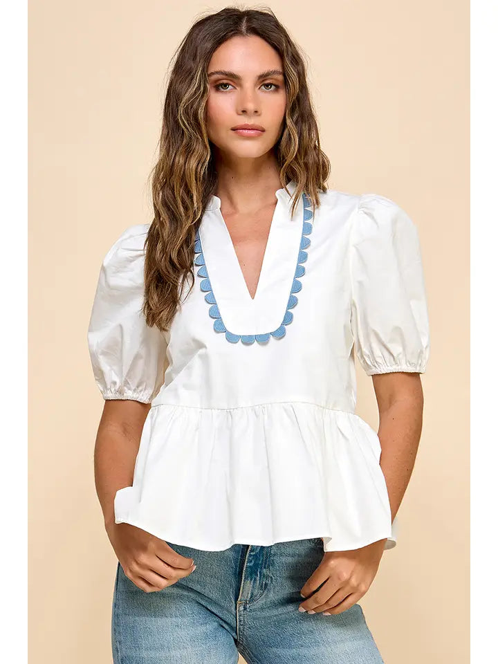 Split V-Neck top, with puff sleeves and a ruffle hem. Featuring a scalloped detail on neckline.