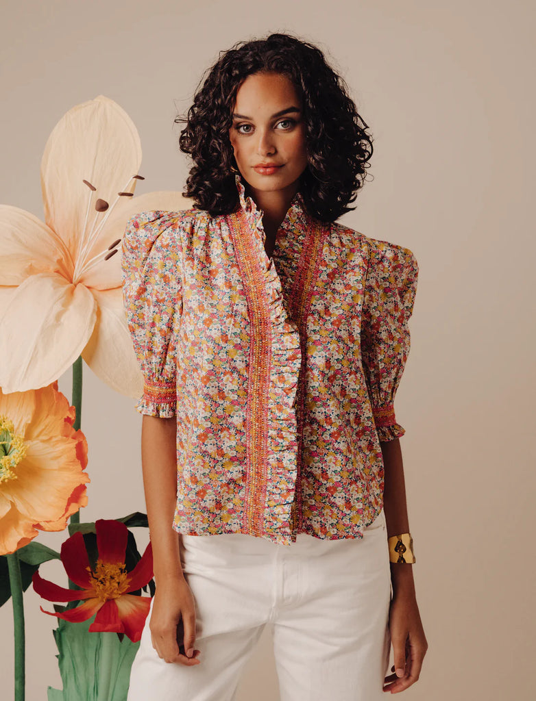 The Zuri Top in Libby Print offers a modern take on classic florals. With its cropped silhouette and short sleeves, this top is ideal for warmer days. The intricate floral print and soft fabric strike the perfect balance between trendy and timeless, ensuring it pairs effortlessly with high-waisted pants or skirts.