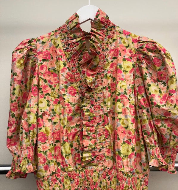 The Zuri top features smocked ruffle detailing and a button down front, with slight puff sleeve.