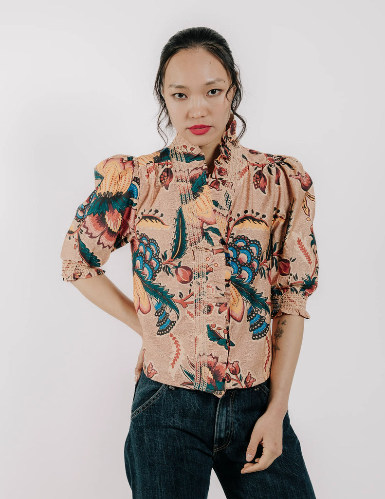 The Zuri top features smocked ruffle detailing and a button down front, with slight puff sleeve.