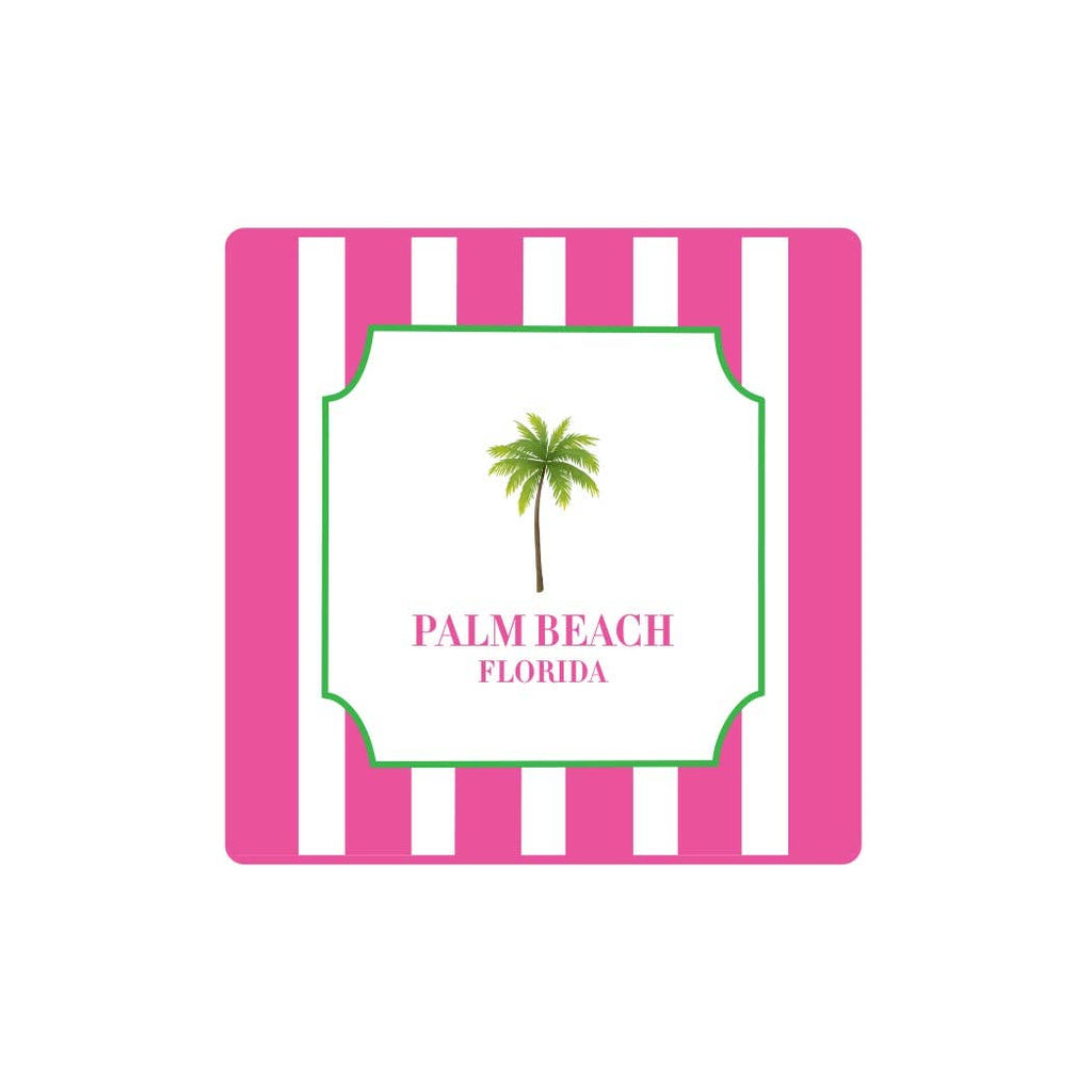 Palm Tree Paper Coasters measure 4x4 and are printed double sided on 110# cardstock. 10 coasters per pack. Indicate your desired text.