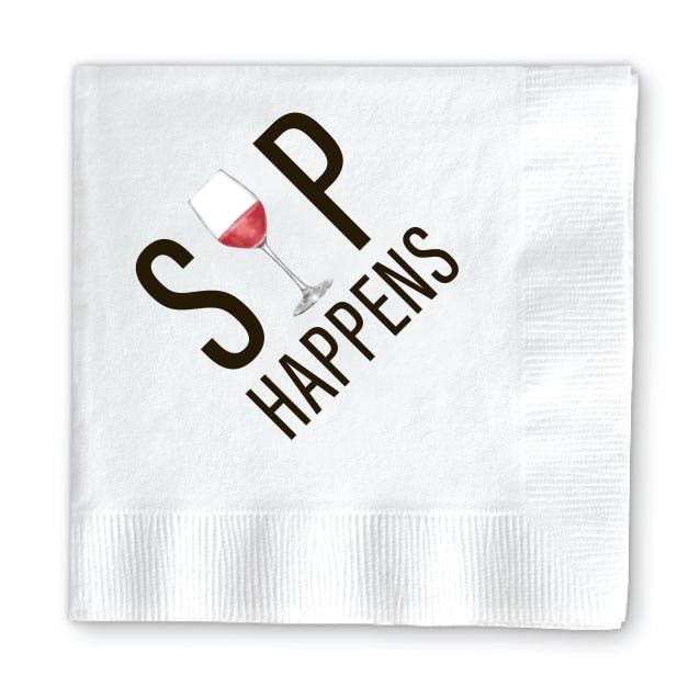 Add a touch of humor to your gatherings with Donovan Designs' Sip Happens Cocktail Napkins. These 5"x 5" napkins come in a pack of 20, providing a fun and practical solution for your party needs. Enjoy your drinks and let the good times roll, because as we say, Sip Happens!