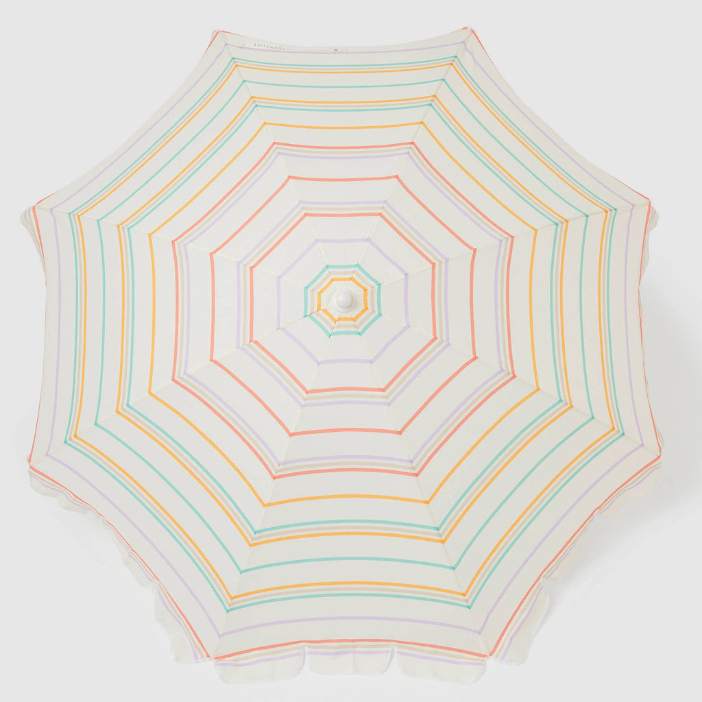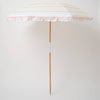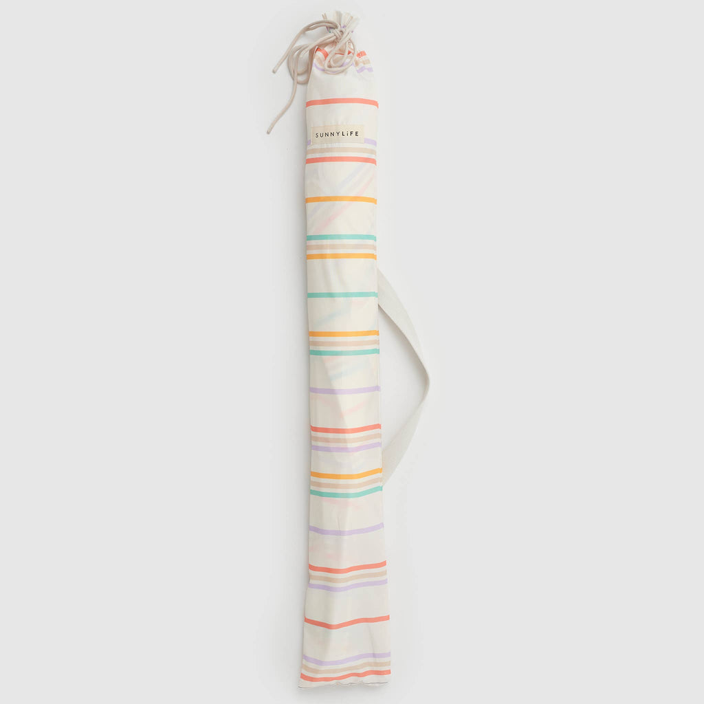 100% polyester. New wider structure: 155cmx210cm open diameter. UPF50 sun protection. Includes a lightweight x4 beach hook attachment for umbrella pole. Wooden pole with sand screw tip for extra grip in the sand. Includes carry bag with shoulder strap for easy transport and storage.