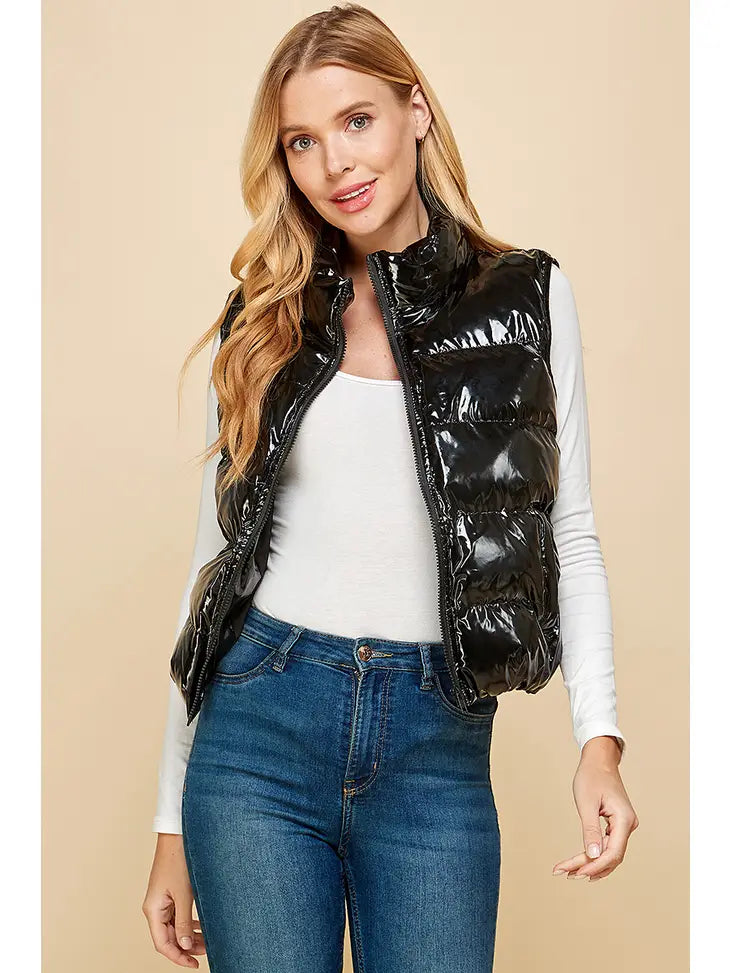 Shiny puffer vest, with side pockets and tiered puffer design. Front zip closure.