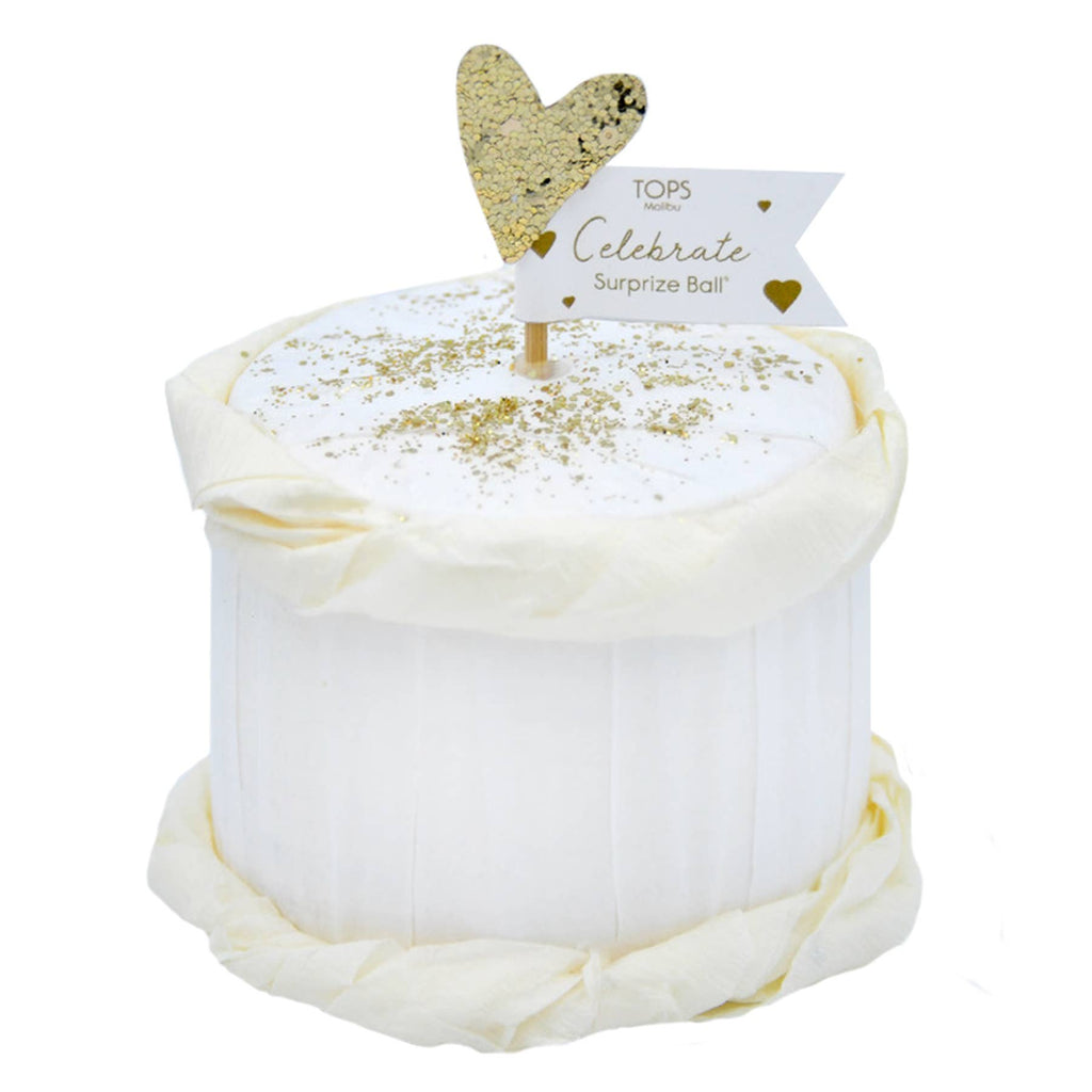 Celebration for two! Filled with sweet gifts to celebrate. An elegantly designed Surprize Ball® with whipped frosting made of crepe paper and topped with gold sparkles, this ball makes a beautiful decoration to compliment the wedding table, or a sweet way to celebrate an anniversary or special union.