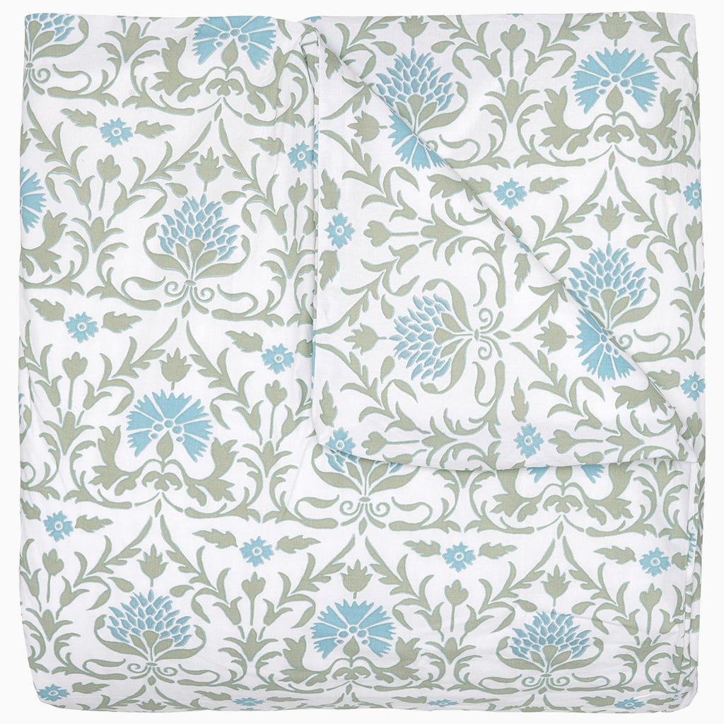Regal blooms and winding vines in soft blue and sage like a finely maintained garden.