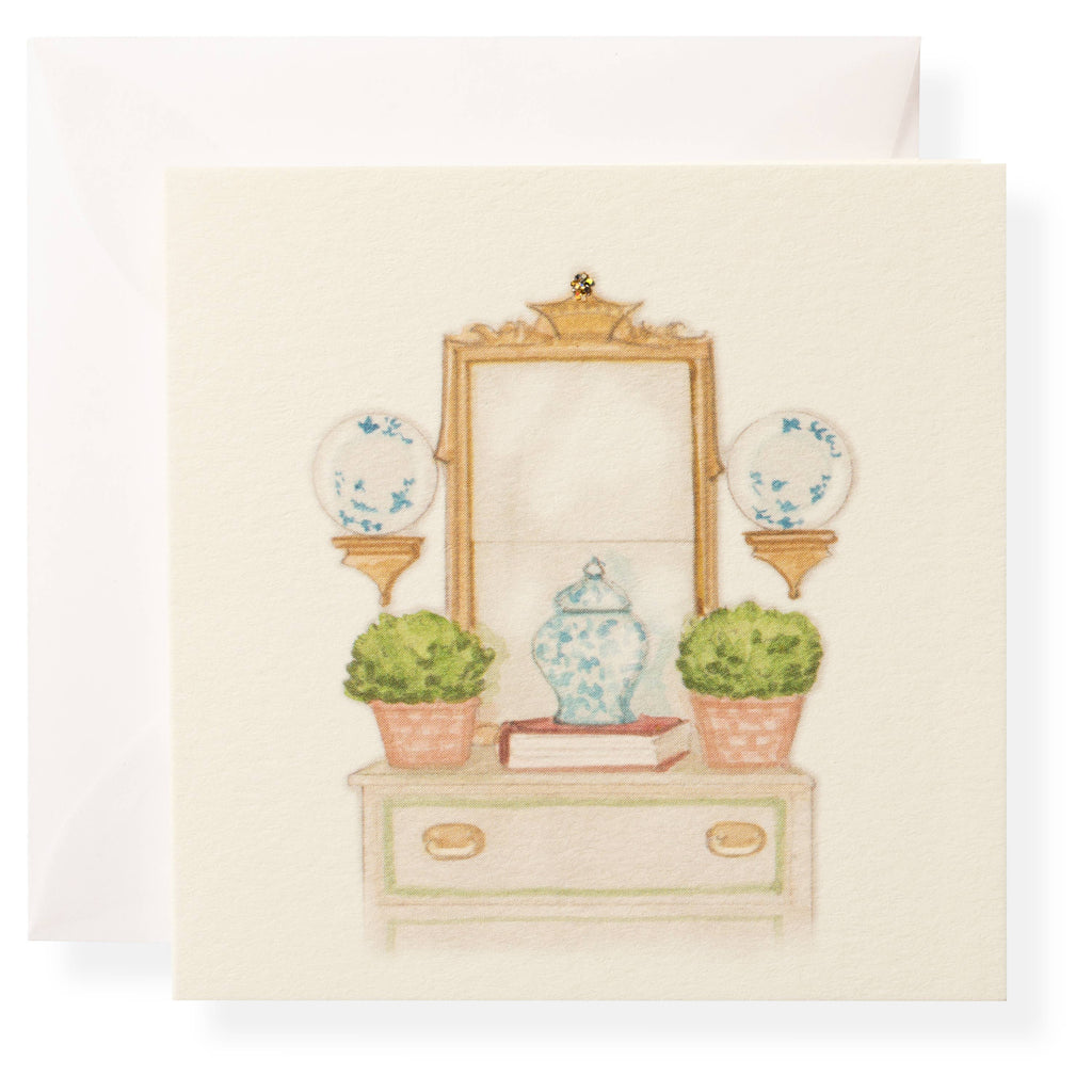 Our Vignette Gift Enclosure is printed and hand-glittered in Memphis, TN. Hand crafted artwork, full color ink printed on natural white paper, hand-glittered, and paired with a vellum envelope. Book-folded enclosure card, blank on the inside.