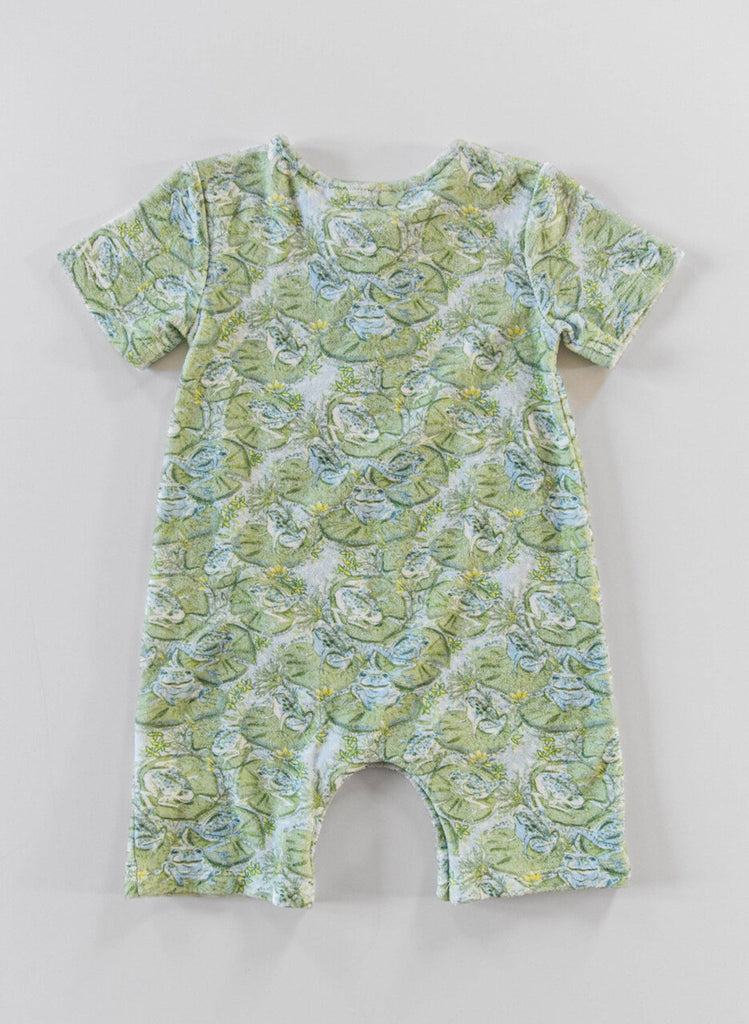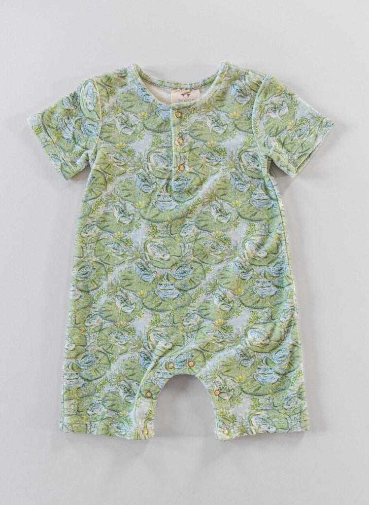 Hop into summer with our Walker terry romper! Made from 100% GOTS certified organic cotton terry, it's the perfect everyday piece in our playful Hoppy Place print of frogs and lily pads painted by Charleston-based artist, Ashley Begley. Comfortable, quick drying, and eco-friendly, your little one will feel extra happy, or "hoppy!"