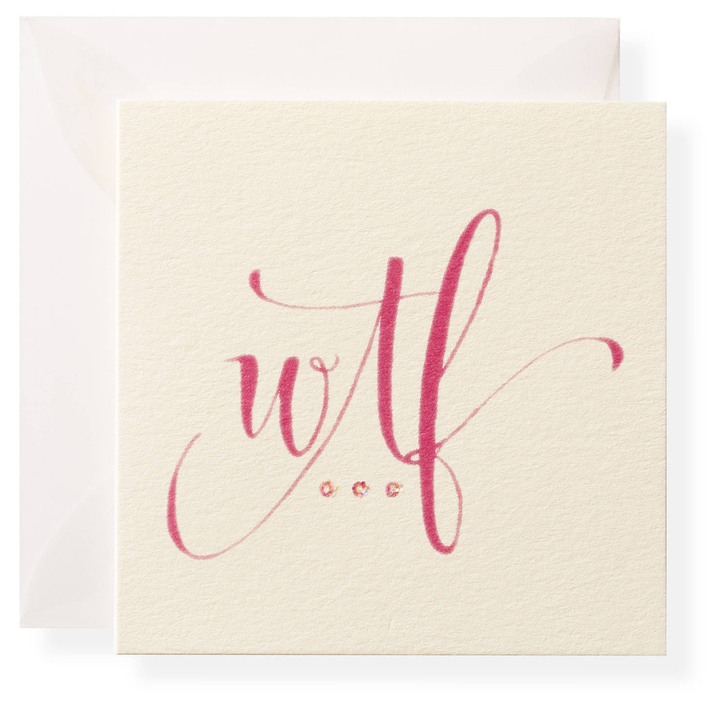 Our WTF Gift Enclosure is printed and hand-glittered in Memphis, TN. Hand crafted artwork, full color ink printed on natural white paper, hand-glittered, and paired with a vellum envelope. Book-folded enclosure card, blank on the inside.